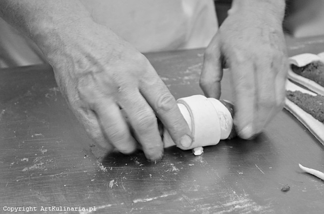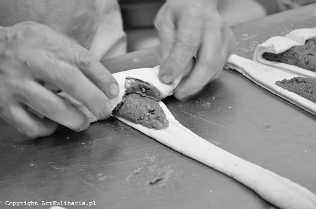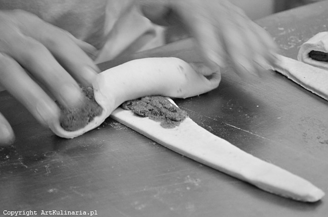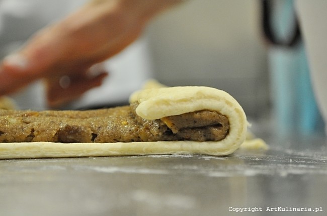 Kiedy mamy uformowane podłużne trójkąty ciasta, przychodzi czas na masę makową. Musi być ona wykonana z najlepszej jakości białego maku. Mieliśmy okazję skosztować i porównać mak od kilku dostawców i ocenić, który jest najlepszy.