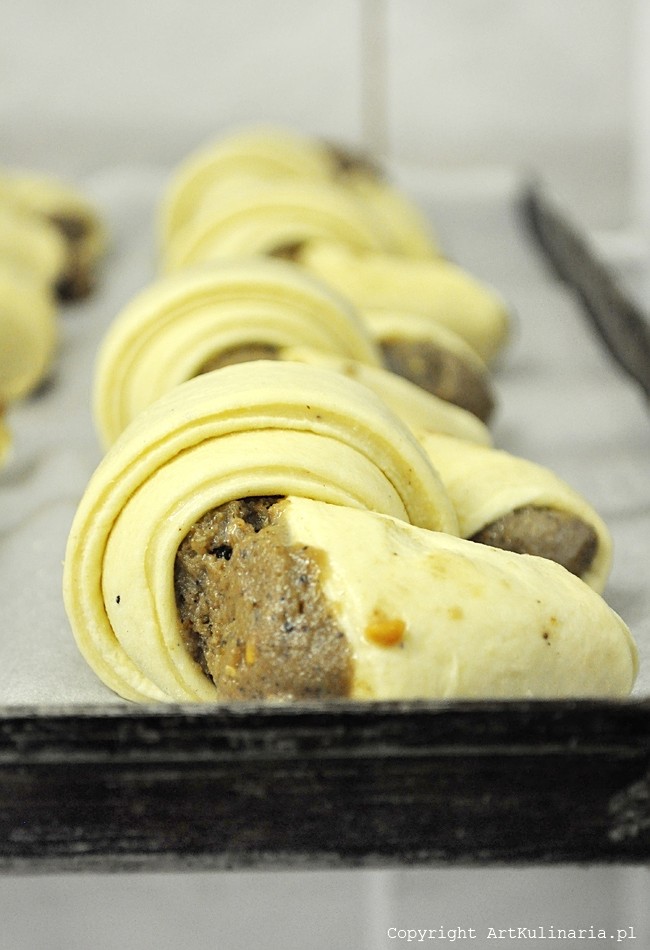 Masa makowa idelanej konsystencji umieszczana jest w rękawie cukierniczym i wyciskana na trójkąty z ciasta. Zawsze na dwa pociągnięcia. Dlaczego? Ponieważ koniec każdego z tych dwóch pociągnieć będzie później nadzieniem w "nóżkach" rogala.
