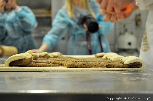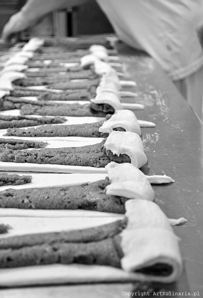 Noc w pokoju hotelowym mija dość szybko. Na szczęście mogę się wyspać. Zbiórka zaplanowana jest na 10:15 przed hotelem, ale przedtem śniadanie w towarzystwie dziewczyn z Pistachio, ChilliBite oraz Ziołowego Zakątka. I przejazd do cukierni, która uczestniczy w akcji AlleRogal. Pan Piotr Koperski należy do Cechu Cukierników i Piekarzy Polskich już przeszło 40 lat, wychował kilka pokoleń cukierników, w tym własne dzieci. Siadamy do poczęstunku i słuchamy opowieści o rogalach, certyfikatach oraz o tym, jak Rogal Świętomarciński zdobył wicemistrzostwo podczas mistrzostw świata w Paryżu. Depcząc po okruszkach nikomu innemu, jak crossaint'owi :-) Jeszcze garstka anegdot i jesteśmy gotowi, aby założyć niebieskie wdzianka i umoczyć ręce w mące. Tu zawsze pojawia się dylemat: praca rąk na migawce, czy na blacie? Na szczęście/nieszczęście okazuje się, że drożdżowe ciasto jest już dla nas przygotowane. Biorąc pod uwagę czas wyrastania, to logistyczne posunięcie, choć z nieukrywaną przyjemnością powyrabiałabym wielką kulę z innymi blogerkami :-) Zaraz dowiemy się, co dzieje się w zaciszu cukierni wypiekającej rogale świętomarcińskie...